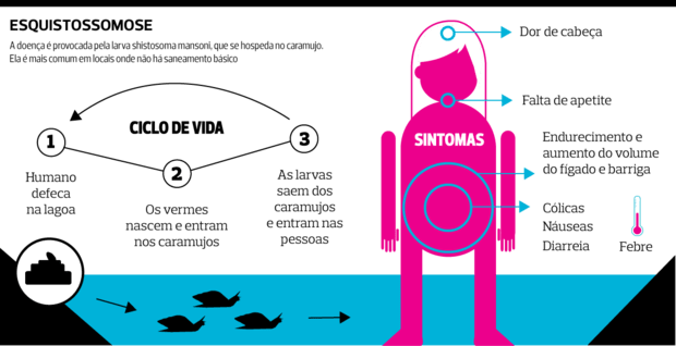 Notícia de surto de esquistossomose em área turística da Bahia, com casos também em turistas.